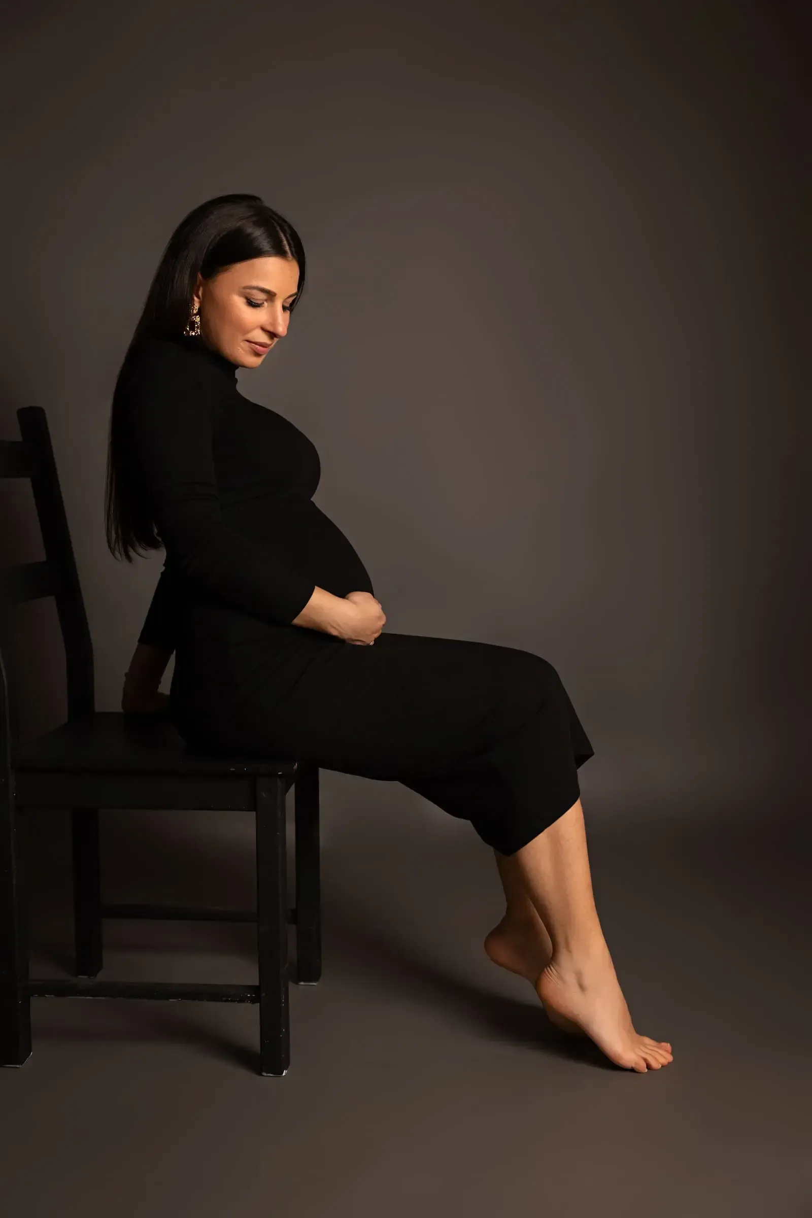 2. Hoher Sitz: Höhe ist ein guter Weg, einen Babybauch zu schmeicheln und in den Fokus zu stellen. Eine Hand kann den Bauch berühren, die andere beispielsweise das Knie.